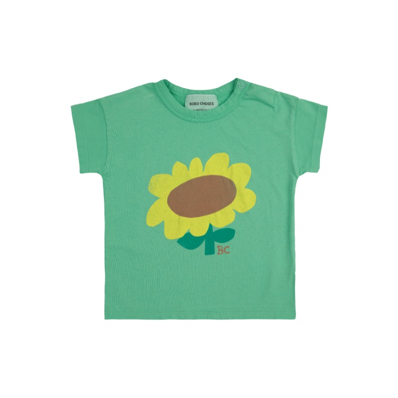 the bobo choses sunflower baby t-shirt is light green organic cotton t-shirt with a big sunflower on the front. this tiny t-shirt has snaps at the shoulder for easy dressing.100% organic cottonmade in portugal