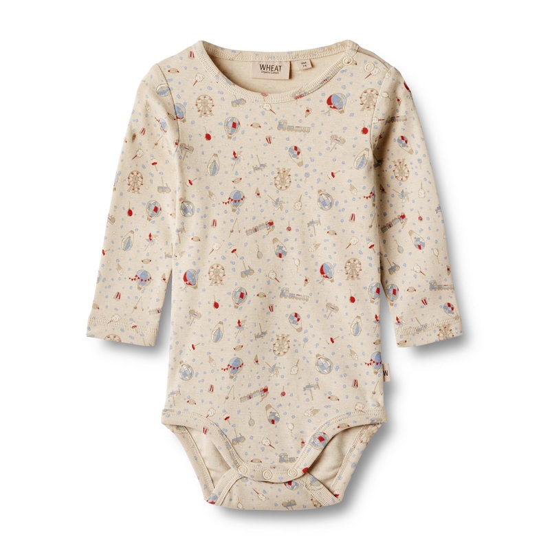 Cute long-sleeved body with print in soft organic cotton for babies. – Press buttons at the shoulder and crotch- Hand drawn all-over printWheats body is unisex and a true essential in your babys wardrobe, as it can be worn on its own or as an extra layer underneath everyday clothing. The bodies either have press buttons at the shoulder or buttons at the neck for better comfort, when you are dressing your baby. The body also has press buttons at the bottom, which makes it easier for you to access your babys diaper. Wheats bodystockings are available in beautiful colours and hand drawn prints, which are made by Wheats in-house design team. The product is GOTS certified.Certified by CUC license no. 1198955Composition- Standard 100 by OEKO-TEX- 100% Organic cotton