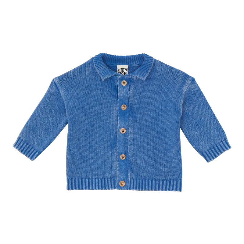 bonton lucien baby cardigan in blue mediterranean. this sweet cardigan has a little collar, wooden buttons and a lovely summer blue wash.100% cotton