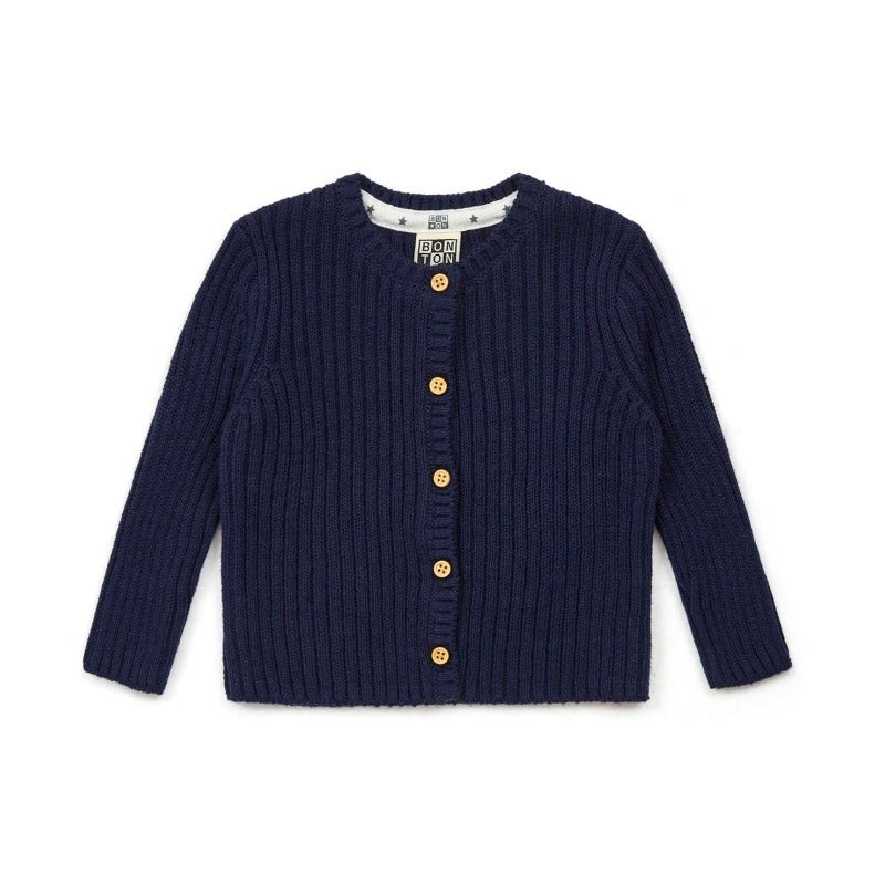 bontonribknit baby and toddler cardigan in navy blue. made with button closure, round neckline and ribbed trims.