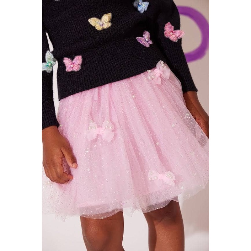 Description:Adorable pink tutu adorned with delicate bows and pearl embellishments for a charming and elegant look.Sparkling tulle fabric with star glitter details adds a touch of magic and whimsy.Elastic waistband ensures a comfortable and secure fit, per