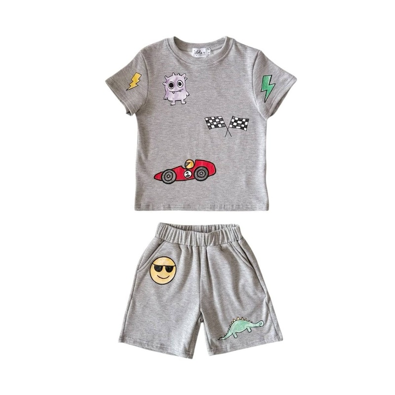 Description:Two-piece grey short set designed with playful patches like a race car, rocket, dinosaur, and moreMade from super soft, breathable fabric with just the right stretch to keep up with every adventureComfy elastic waist shorts and easy pull-on tee