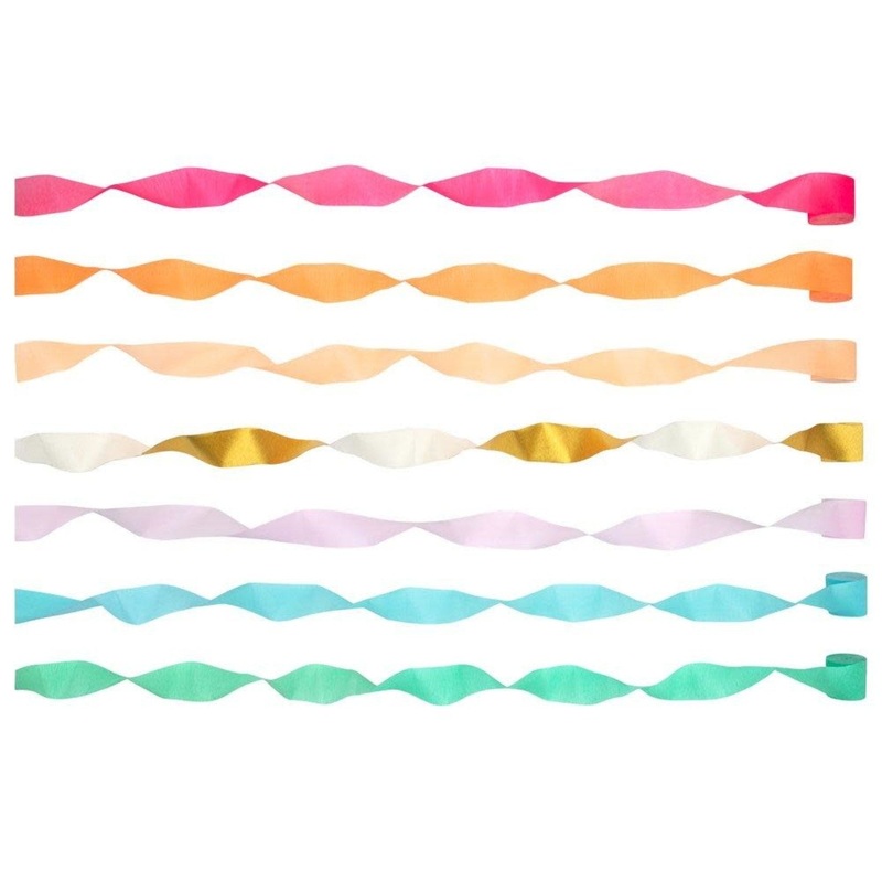 These rainbow paper streamers are perfect to add a splash of color to any party. Featuring seven different colored streamers.