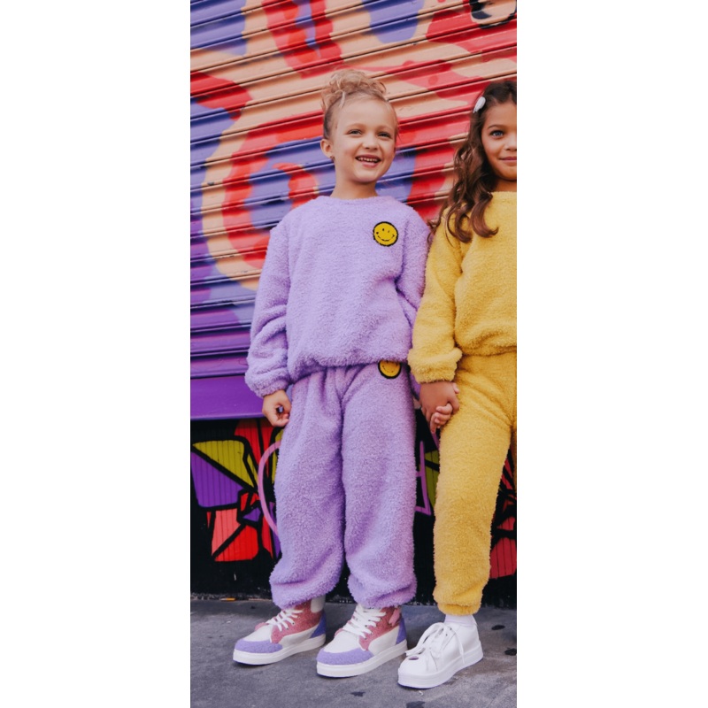 - Stay cheerful and comfortable with this lavender fuzzy set featuring a cute smiley patch for a playful vibe.