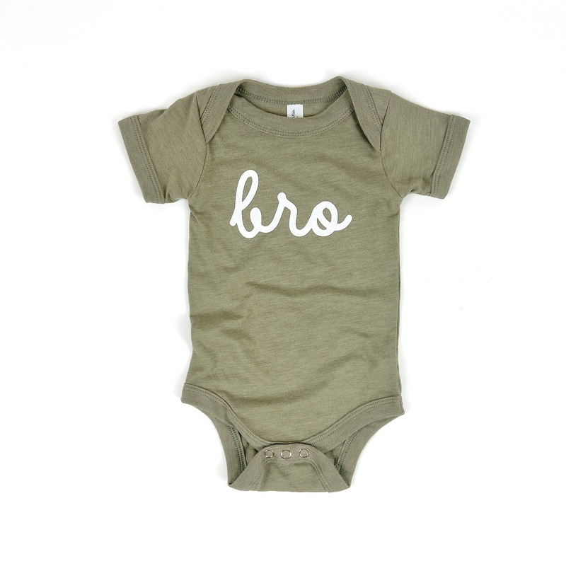 Looking for something for little bro? This comfy bodysuit boasts a modern script in white ink on a lush olive green bodysuit. Made with love and screen printed on-site by Gladfolk.