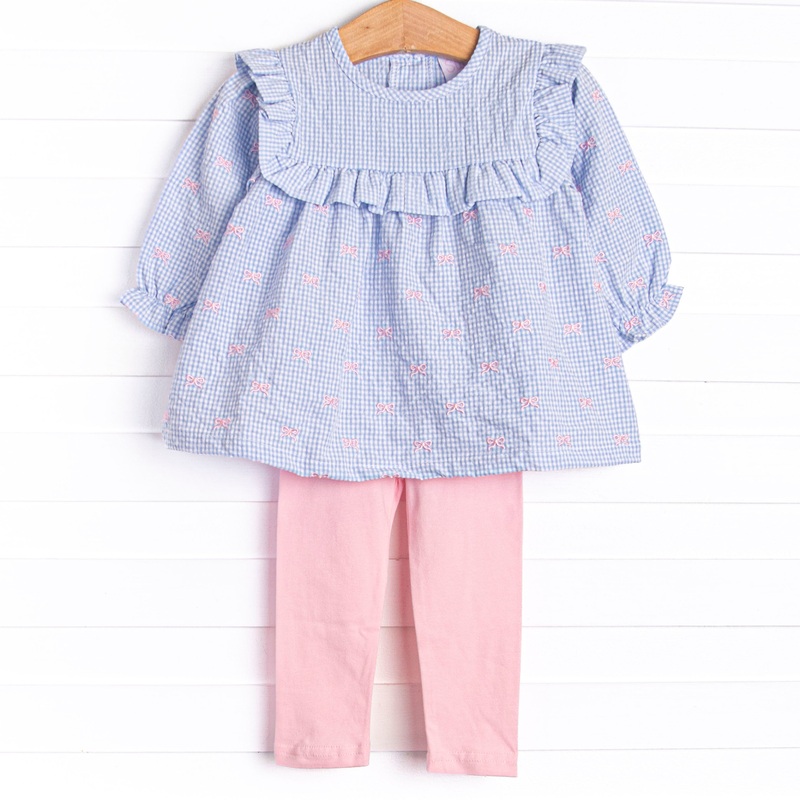 Brooksy Bows are just too beautiful! This set features a blue gingham top with ruffle trim and pink bow embroideries. Coordinating pink leggings to match. This set is sure to be her favorite!