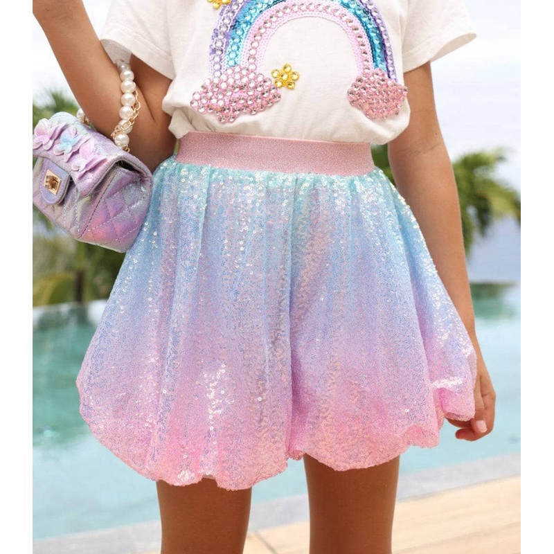 - Shimmering ombre sequin skort in pastel pink and blue, reminiscent of sweet bubble gum hues.