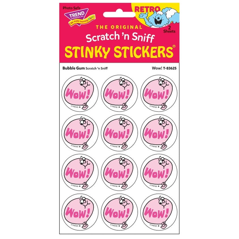 Trend has recreated some of their original sticker designs.24 Bubble Gum WOW scented stickers2 sheetsStickers are 1.25" roundMatteNon-ToxicAcid-FreePhoto safeMade in the U.S.A.Collectors will be happy to spot the to distinguish Retro Stinky Stickers from t