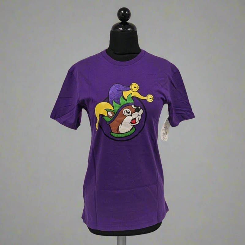 At we think the best way for you to celebrate Mardi Gras 2025 is with this Buc-ee's festive Mardi Gras t-shirt! This vibrant purple tee is as comfortable as it is stylish. The design showcases Buc-ee the beaver decked out in a playful jester hat, complete