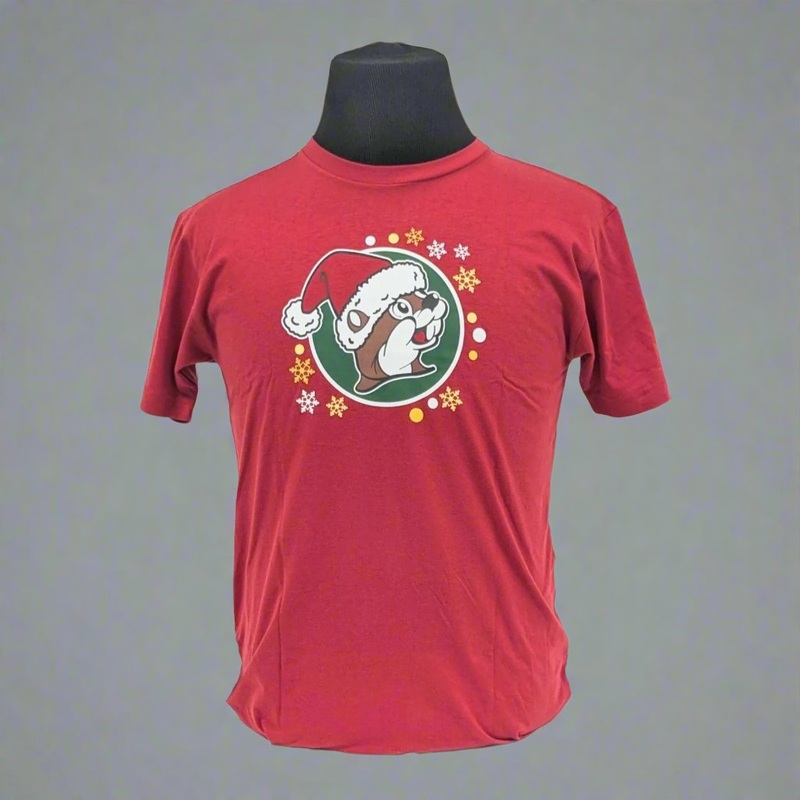 - Front Design: Buc-ees iconic beaver wearing a Santa hat, surrounded by snowflakes and holiday ornaments.
