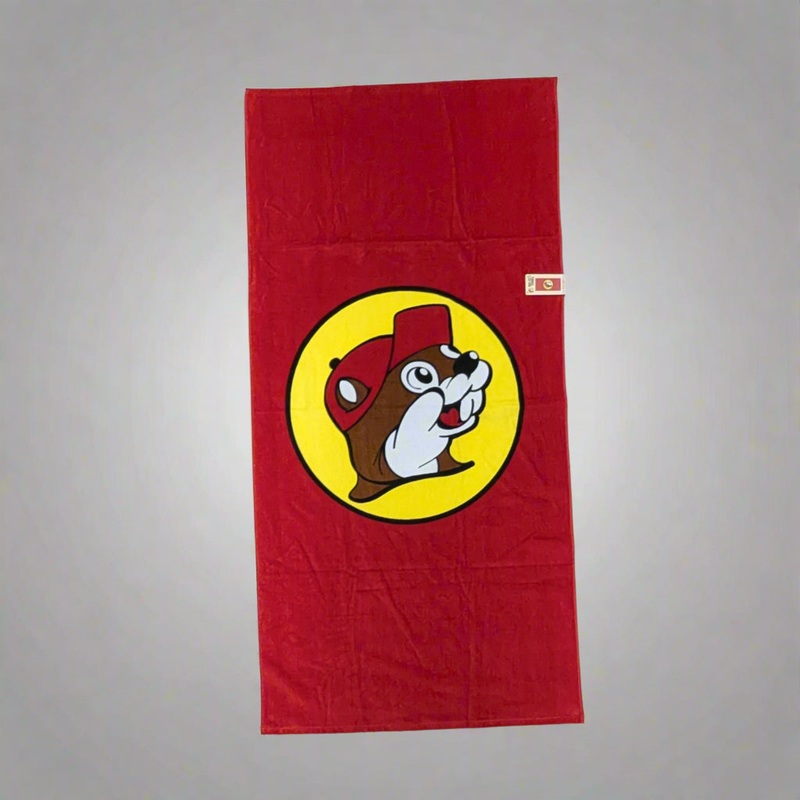 At we love this towel and things it’s a great way to soak up the sun. It’s a classic Buc-ees style with this bold and vibrant beach towel. Made from 100% cotton, it delivers unmatched comfort and absorbency, perfect for beach days, poolside lounging, or simply adding a pop of Buc-ee’s pride to your home. The towel features the iconic Buc-ees logo prominently displayed in the center, set against a solid red background thats unmistakably eye-catching. Whether youre a lifelong Buc-ee’s fan or new to the beaver brigade, this towel is your ultimate go-to for making waves and staying cozy.