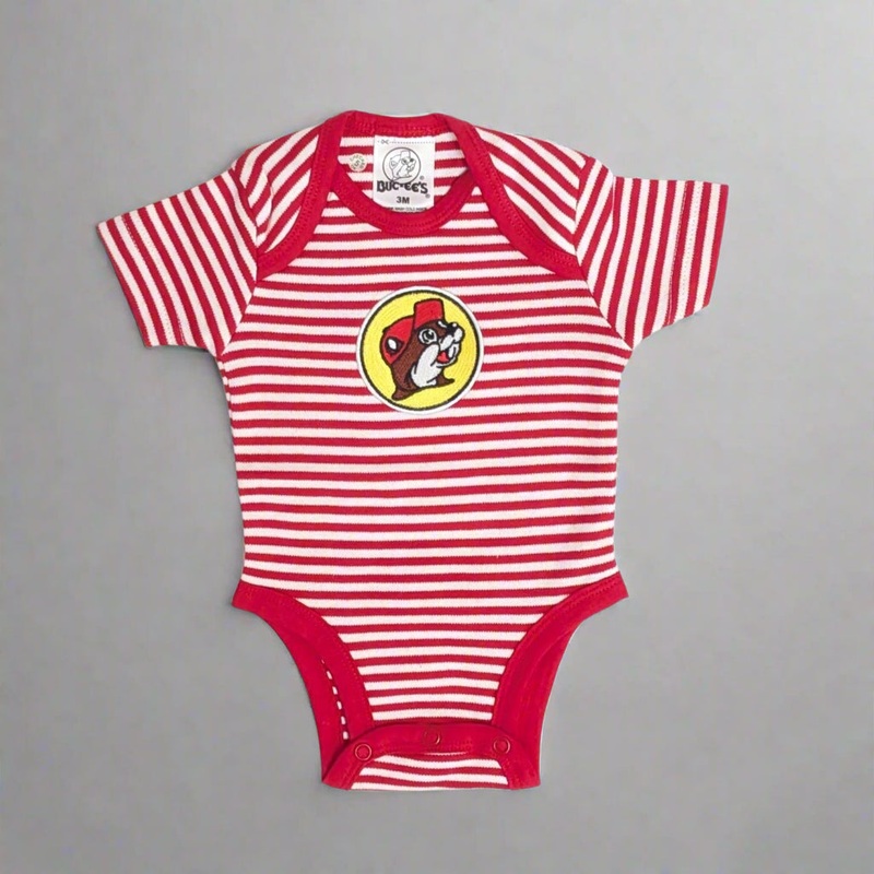 Dress your little one in comfort and style with the Buc-ee’s Red & White Striped Infant and Toddler Onesie and shirt! Featuring a classic red and white striped pattern, these are made from soft, breathable fabric to keep your toddler cozy all day long. With easy snap closures for quick changes and a playful Buc-ee’s logo on the chest, its the perfect addition to any toddler’s wardrobe.
