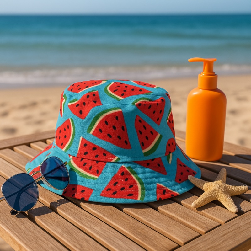 Shade in style! This bucket hat is a fun and practical accessory for sunny days. Lightweight and breathable fabric for comfortable wear Wide brim provides sun protection for face and neck Soft Watermelon print adds a playful touch to any outfit Easy to fol