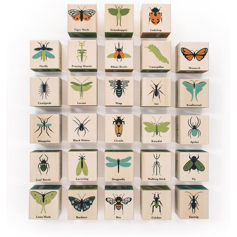 These wooden blocks from Uncle Goose aren’t your ordinary blocks, and theymight change your mind if your little one thinks bugs are gross.Each side of the block reveals a detailed close-up of the insect featured on its opposite side. Colorful Art Nouveau upper and lowercase letters grace the remaining four sides. Explore patterns + etymology in a block set where nature meets design.