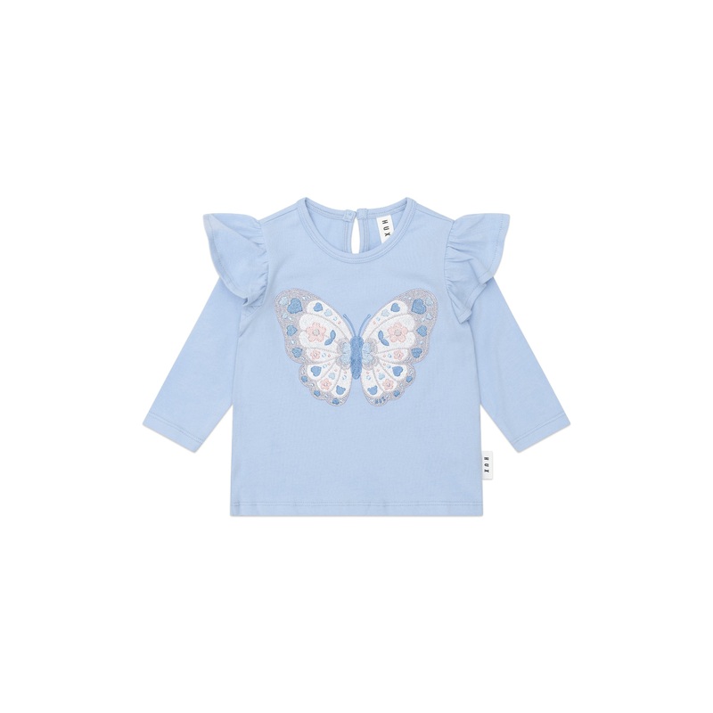 A long-sleeved round neck top, with super sweet shoulder frills. Made from cloud-like organic cotton, it features butterfly embroidery with sparkly detailing. Baby sizes include stainless steel shoulder snaps for even easier dressing.Celestial blueMid-weig