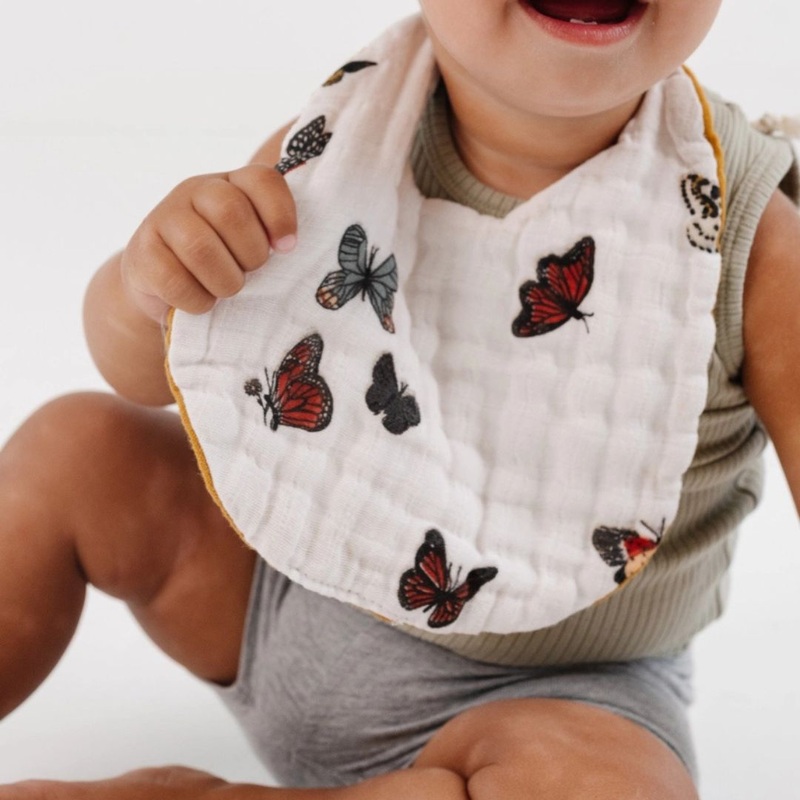 This adorable double-layered muslin bib is now available in our best-selling print from Clementine Kids! 8-inch braided ties secure this bib in the bag, and it’s super absorbent, ready for little ones’ spills.