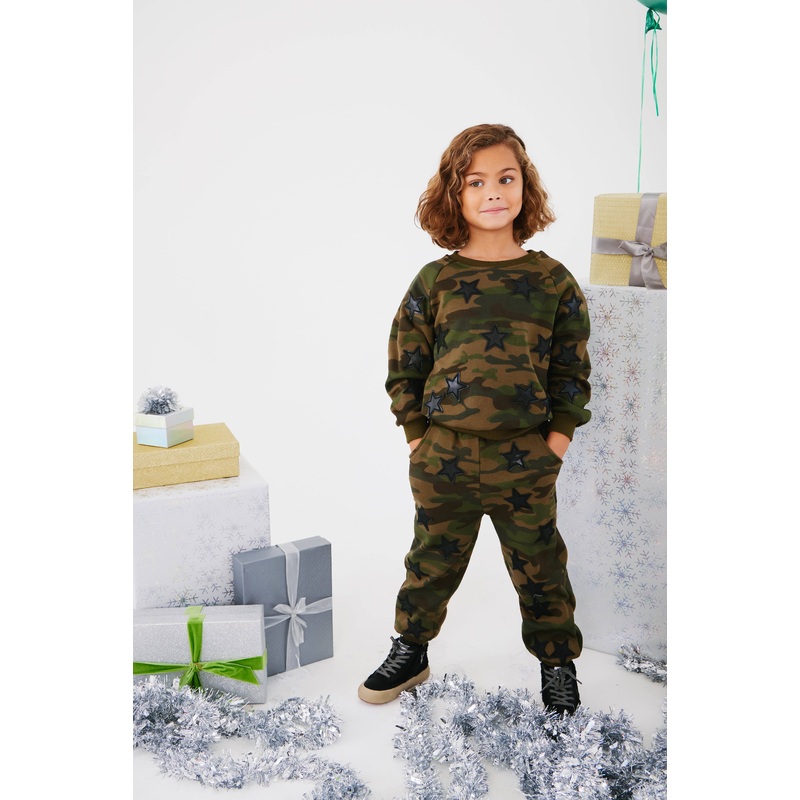 Description:Stylish camo set featuring a cool camouflage pattern and black star appliques for an edgy look.Comfortable sweatshirt and matching jogger pants for a coordinated outfit.Crafted from soft, durable fabric ensuring all-day comfort and longevity.Ma