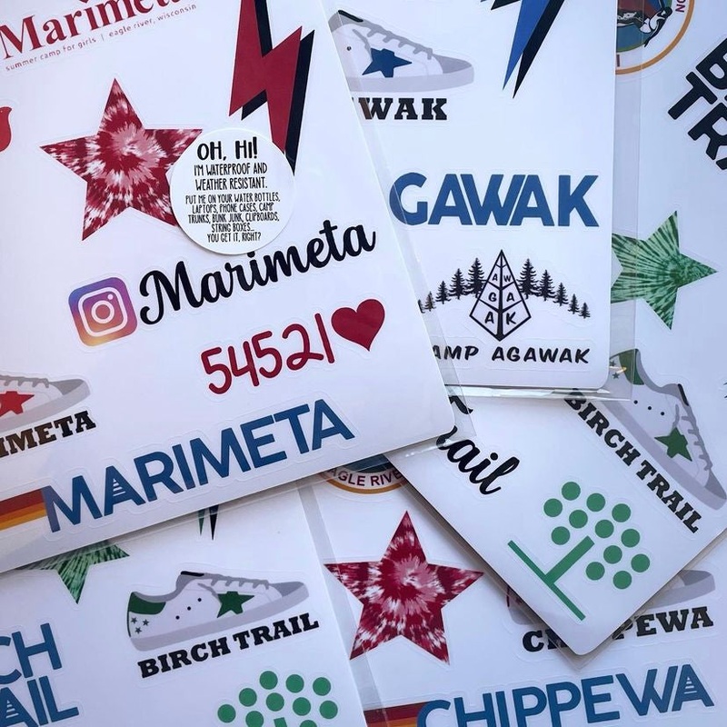 Set includes 12 printed stickers with camp designs.
