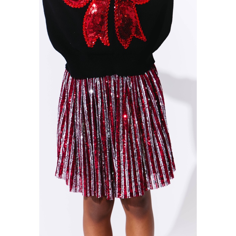 - Festive and stylish skirt adorned with eye-catching candy cane sequin stripes in red and silver.