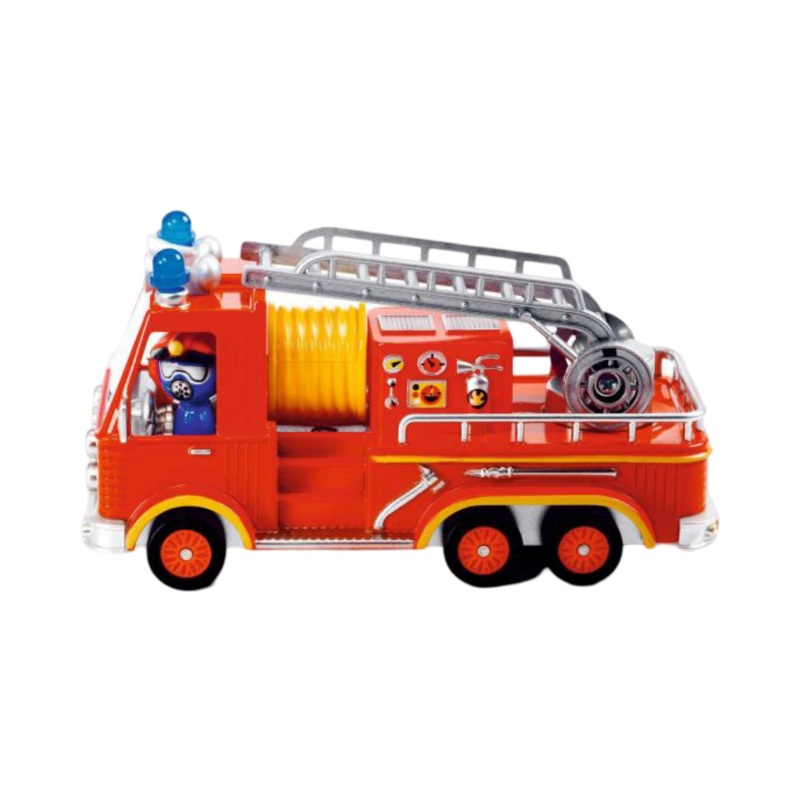 Fire alarm! The siren rings out through the station! Fire Truck whooshes past to get to the scene as fast as possible! The ladder is deployed and the firefighters arrive in time to put out the flames. Good job!