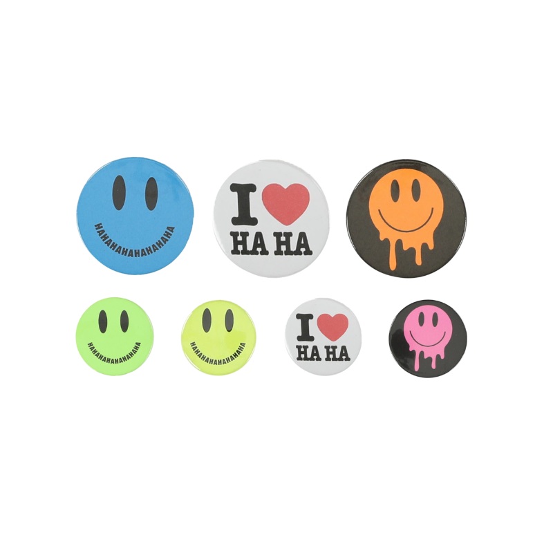 caroline bosmans i love haha round pins set of 7 . features various differentcolored smileys faces and 2 i love haha pins.