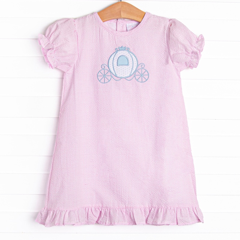 These styles are fit for a Queen! This dress features a pink gingham seersucker print, puff sleeves, and a carriage applique. The perfect dress for a Carriage Cutie!