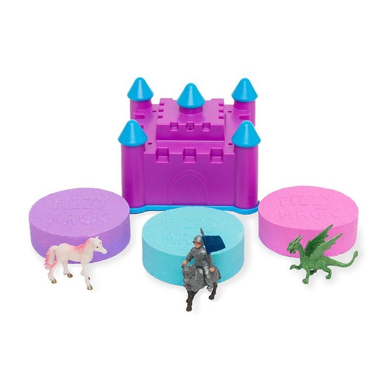 NEW Innovative Bubbling Fizzing Castle Water Toy Contains Water Toy, Puck Fizzy with Surprise Inside & Castle Quiz High Quality Fizzies with Pure & Safe IngredientsDuo Pack of Bath Bombs with Unicorn, Knight & Dragon Surprises Random Pink, Blue or Purple S