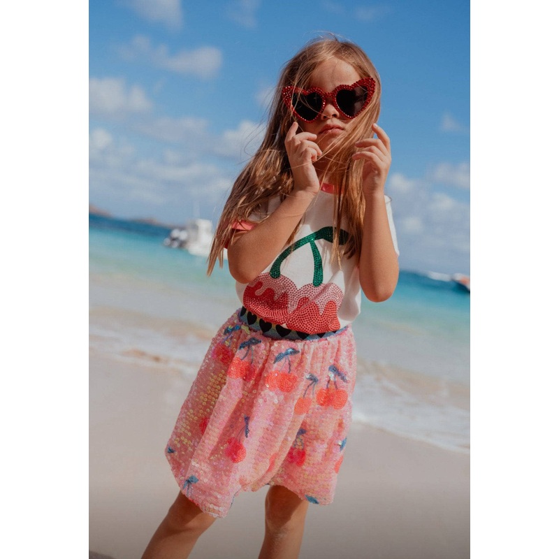 - Sparkling pink skirt adorned with sequin cherry embellishments.