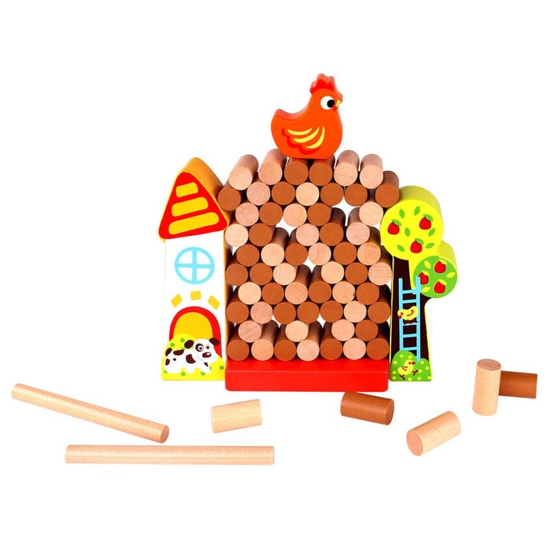 The wooden farm-themed Jenga game is a fun and interactive game for both children and adults. This game is easy to learn, but hard to master. Taking turns, one at a time, players must try and remove their coloured rods (light or dark rods) from the frame without letting the chicken fall off. Long rods are given to each player to help them push the rods off the pile, but be careful, it might fall!