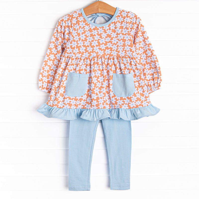 Nothing cuter thanChrysanthemum Compliments! This set features a top in a peach floral print, ruffle trim, and front pockets. Coordinating blue knit leggings to match. This set will be your little cutie’s new favorite!