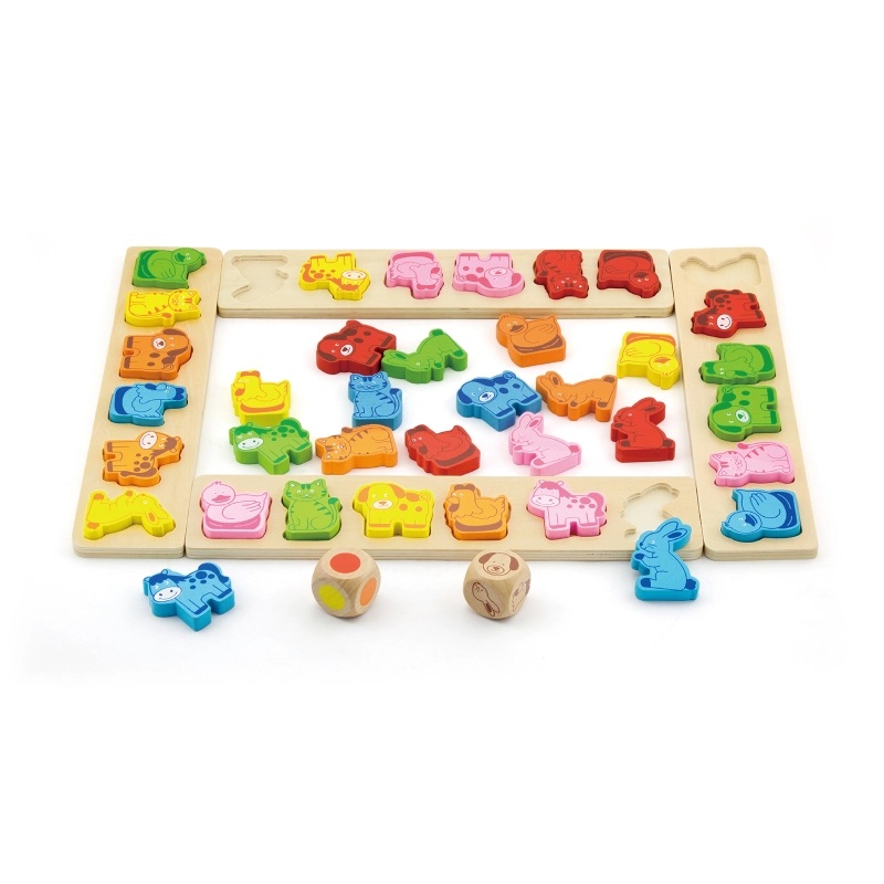 -Includes: 4 wooden panels, 36 animal pieces and two dices.