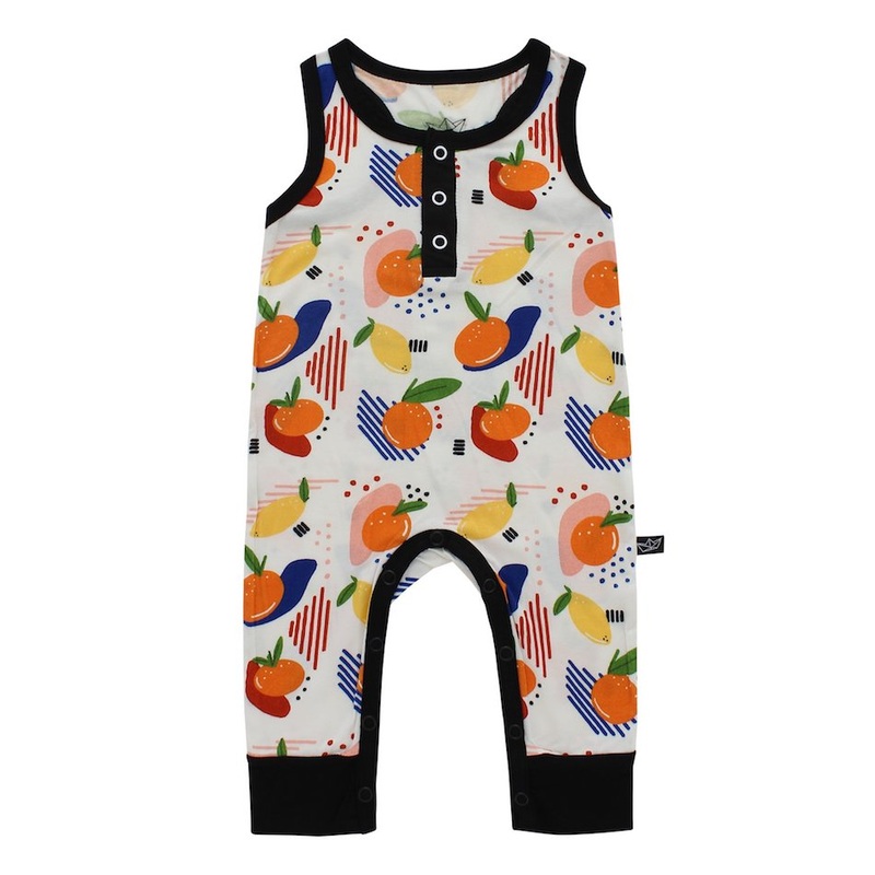 Introducing the Peregrine Kidswear Citrus Tank Romper – 6-9 Months. This bright and fun fun print is packed with Vitamin C! Abstract Oranges and Lemons, complete with confetti, make for the perfect style for your sun-kissed babe.