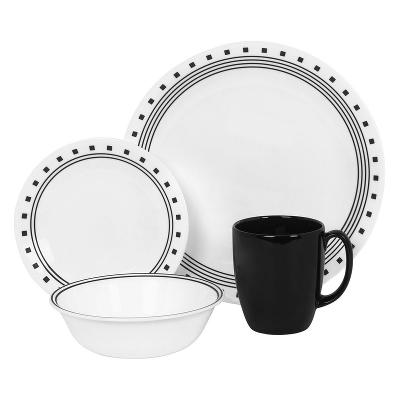 The City Block Livingware Set 16pc 1074208 is a great versatile addition to your table whether you're eating breakfast, lunch, dinner or entertaining. Black stripes and bold squares give this set an urban edge. Each piece has a different design, and the co