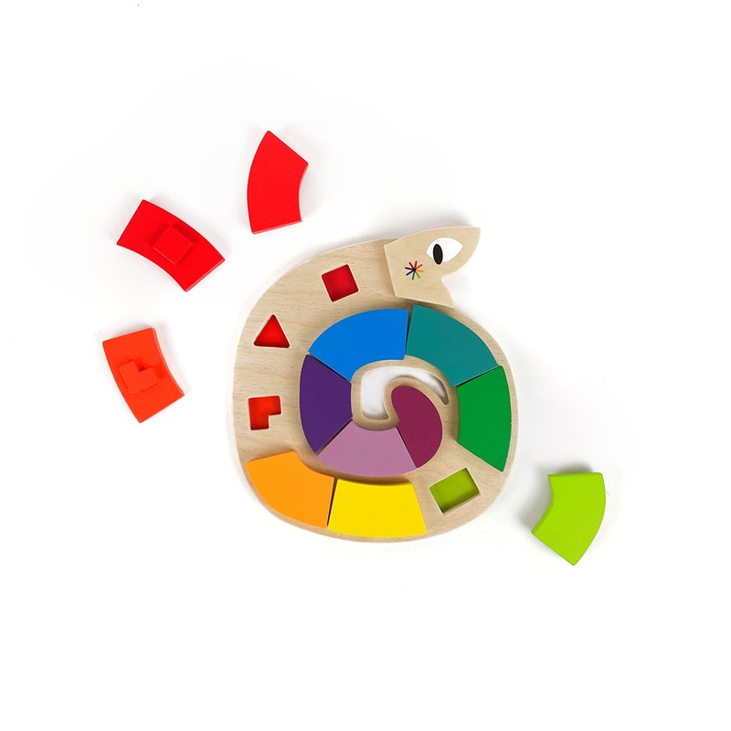 This brightly colored snake puzzle has so many different levels of play! The pieces fit together like a puzzle. Little ones can remove and match the color pieces, or underneath each piece is a 3-dimensional shape that can also be matched.Dimensions: 10.43