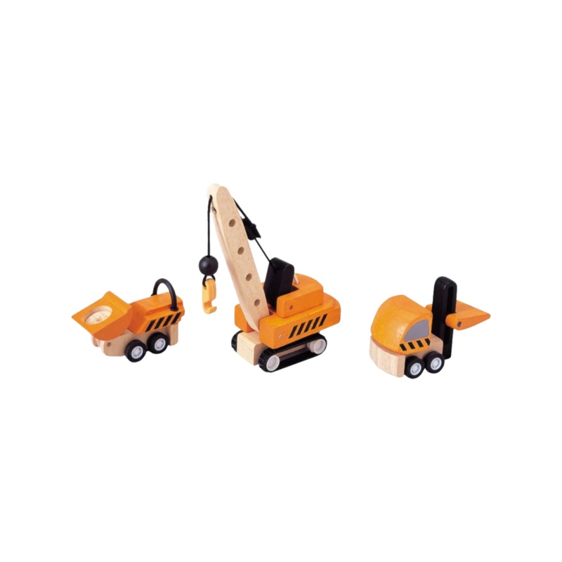 • Set comes complete with 3 construction vehicles made of wood and equipped with rubber tires