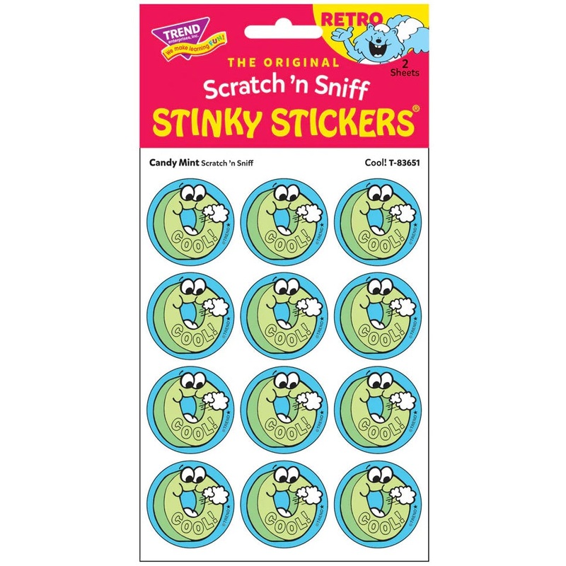 Trend has recreated some of their original sticker designs.24 Mint scented stickers2 sheetsStickers are 1.25" roundMatteNon-ToxicAcid-FreePhoto safeMade in the U.S.A.Collectors will be happy to spot the to distinguish Retro Stinky Stickers from those print