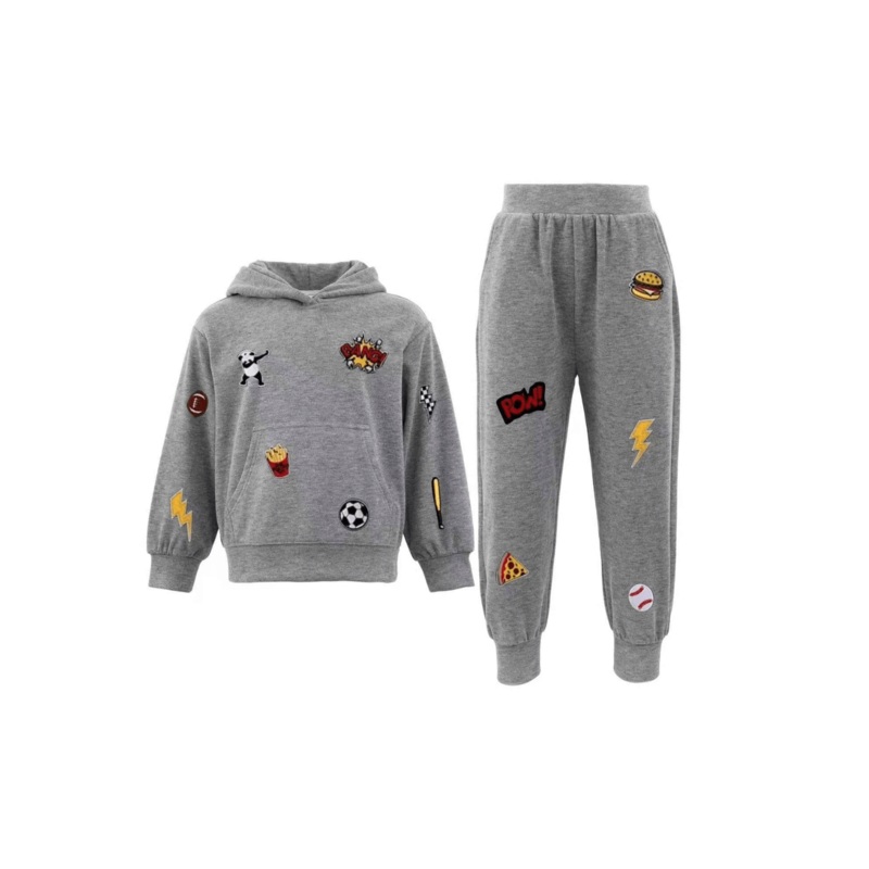 - Grey hoodie and jogger set adorned with fun, colorful patches including sports, snacks, and comic-style graphics.
