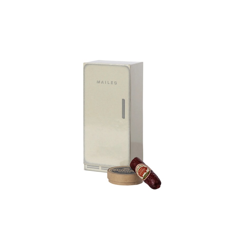 The perfect place to store your groceries so they stay fresh and cold. Inside the cooler, you find a small sausage and cheese. The cooler is made of cardboard and fits perfectly into the mouse castle.
