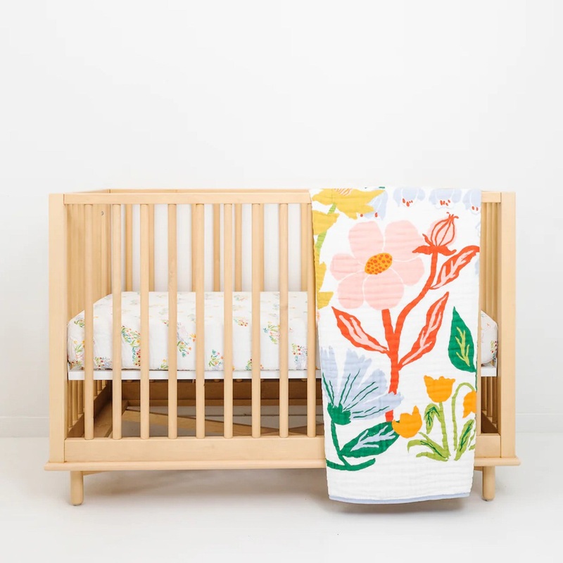 One of the newest prints to be released by Clementine Kids (in a partnership with The House that Lars Built) is this adorable garden-inspired floralquilt. Colorful, bold spring flowers cover the front, thereverse is asoftbluecolor.Fourlayers of muslin fabr