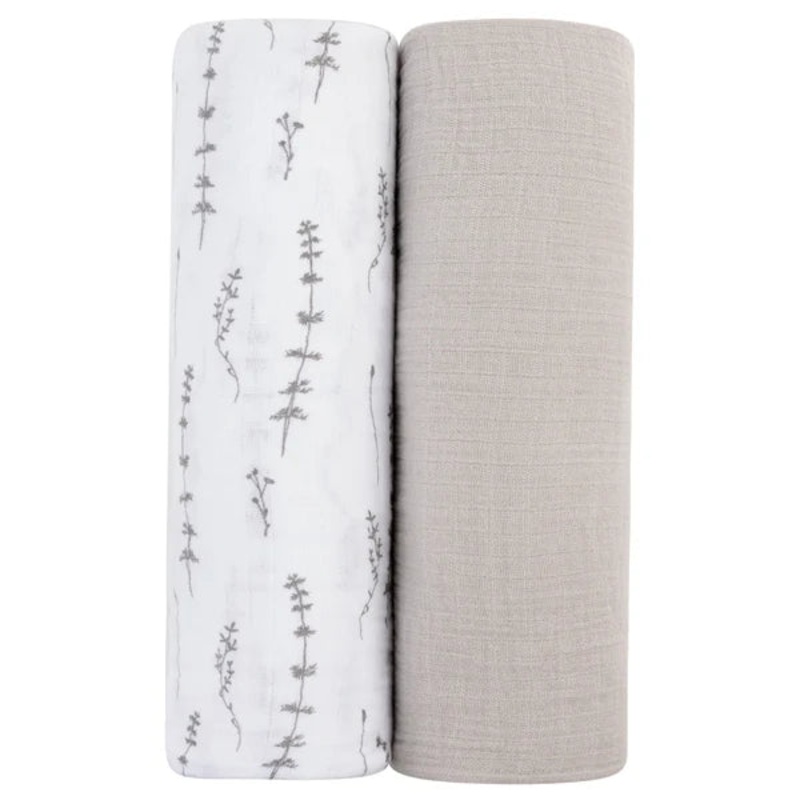 Cotton Muslin Swaddle 2 Pak | Forest Grey Leaf | Pebble Grey | Ely’s & Co