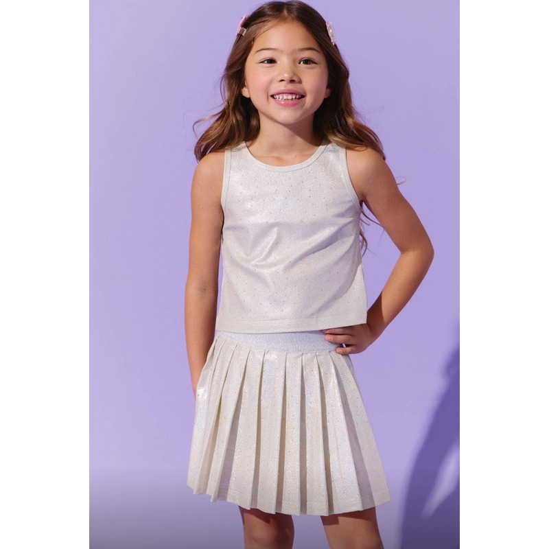 Description:Elegant cream tennis set adorned with shimmering crystal detailing for a sleek, standout look.Features a fitted sleeveless top and pleated skirt for a stylish, classic silhouette.Perfect for special outings, celebrations, or making a dazzling s