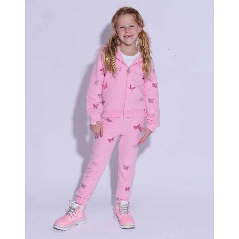 Description:Adorable pink trackset adorned with sparkling crystal butterfly designs, adding a whimsical touch to your casual wear.Made from soft, breathable fabric that ensures comfort during playtime or casual outings.The glittering butterfly embellishmen