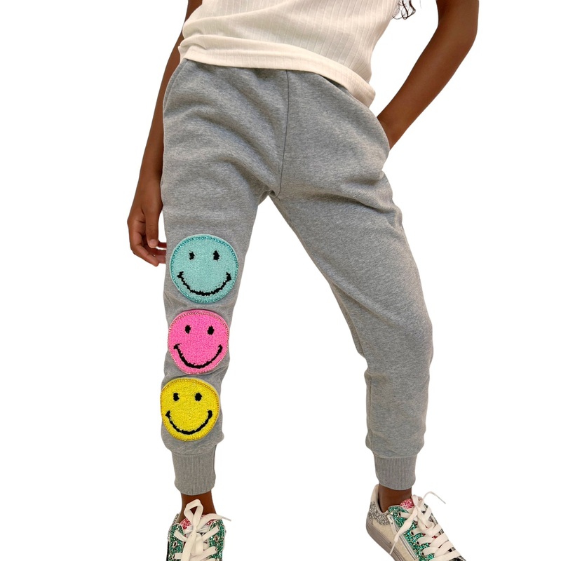 - Add a playful touch to your casual wear with these Crystal Emoji Joggers featuring vibrant, sparkly smiley patches that pop against the soft grey fabric.