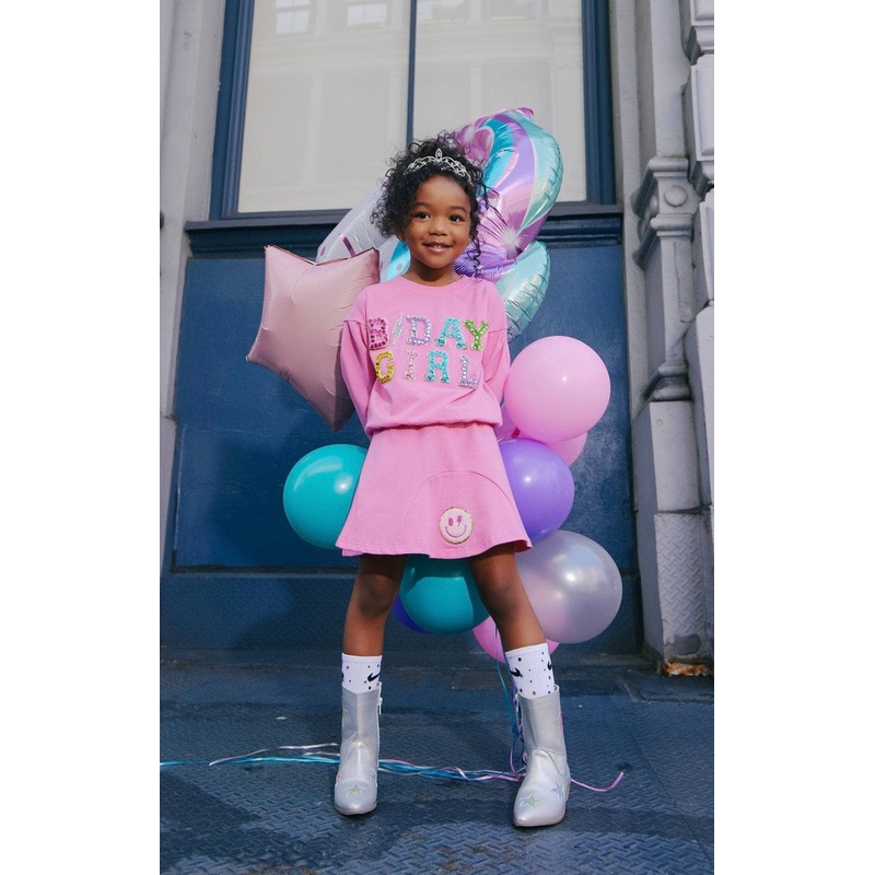 Description:Adorable pink set featuring "B'DAY GIRL" embellished with colorful crystal gems.Includes a long-sleeve top and matching skirt with a cute smiley face patch.Perfect for making any birthday girl feel special and stylish on her big day.Material &