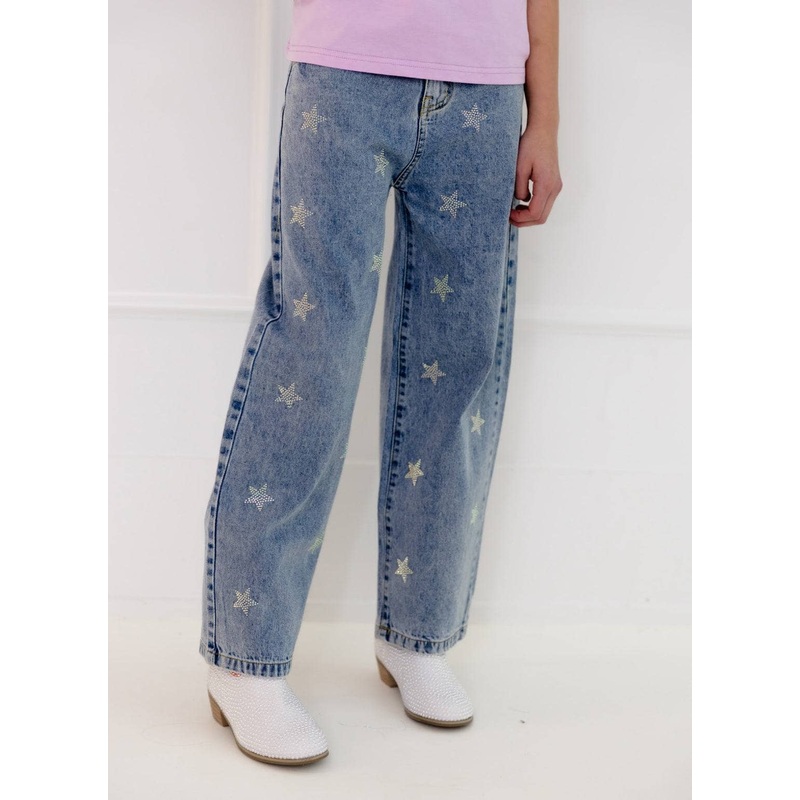 - Trendy denim jeans adorned with sparkling crystal star embellishments throughout, perfect for adding a touch of glam to any casual outfit.