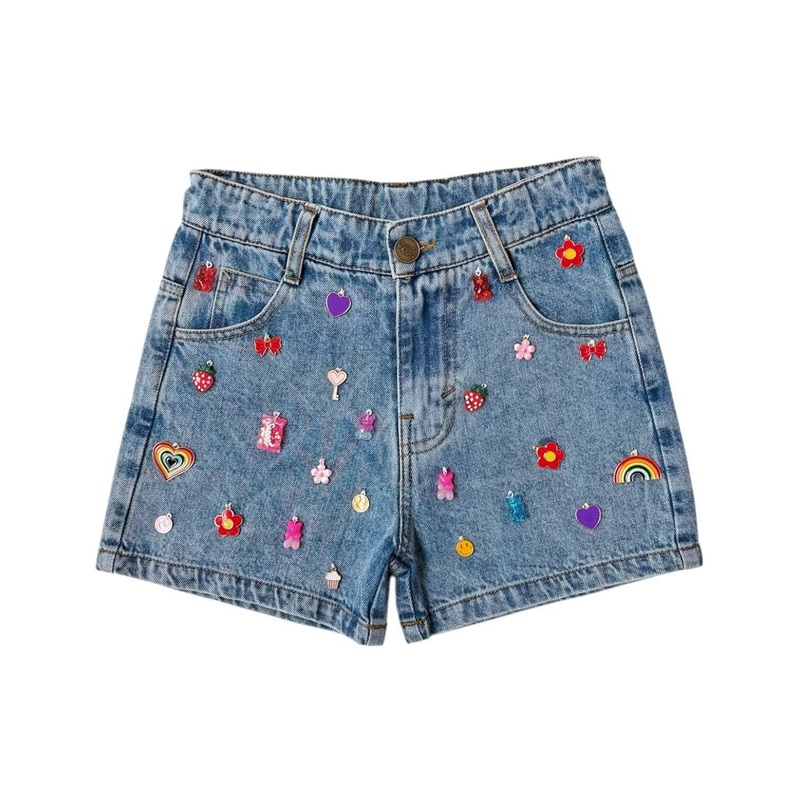 - Playful denim shorts decorated with colorful gummy bear, fruit, rainbow, and heart patches for extra flair.
