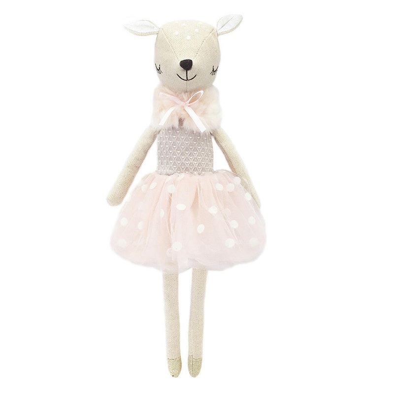 This elegant doll is designed with exquisite detail....meet Daisy! A MON AMI best seller and perfect keepsake gift. Perfect for play, room decor, and gift giving, she comes in a stunning blush pink fur shaw, and polka dot tulle dress. She is sure toput a s