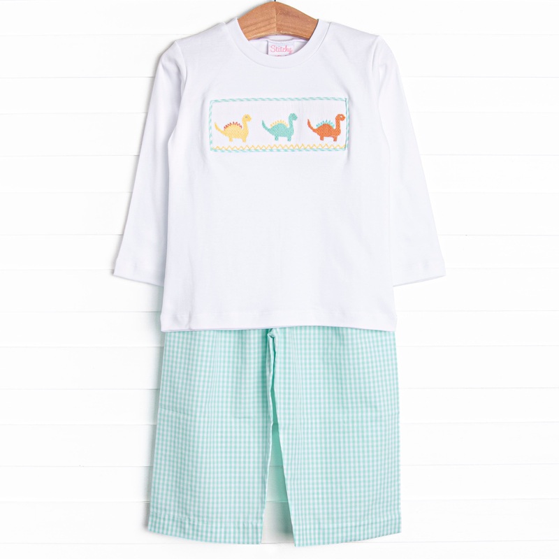 The most darling Day at the Museum! This set features a long sleeve top with a dinosaur smocking, and coordinating mint gingham pants to match. This set is sure to start a ROAR!