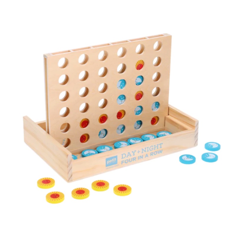 A celestial take on a classic game, be the first to get the suns or moons to align in this Day + Night Four in a Row Wooden Game!The cheerful sun and moon pieces smile back as your little ones play to be the first to get four in a row.Made using FSC wood.