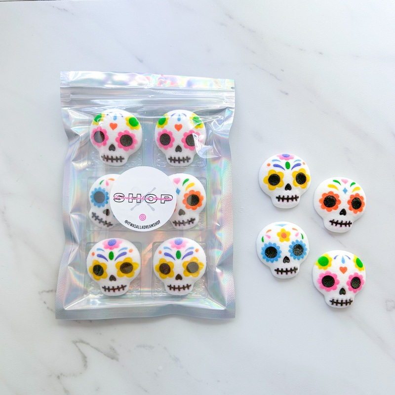 This set comes in a pack of (6) piecesEach sugar skull measures 1.2"Add bright colors and instant theme to your cake creation! These Day of The Dead skulls offer dynamic detail and unique patterns.Made of finely granulated sugar molded into shapes and pain